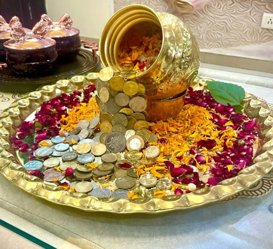 Elegant and intricately designed gold-plated pooja thali set featuring a round plate with matching bowls, kalash, and spoon — perfect for all Hindu rituals, festivals, and daily worship.